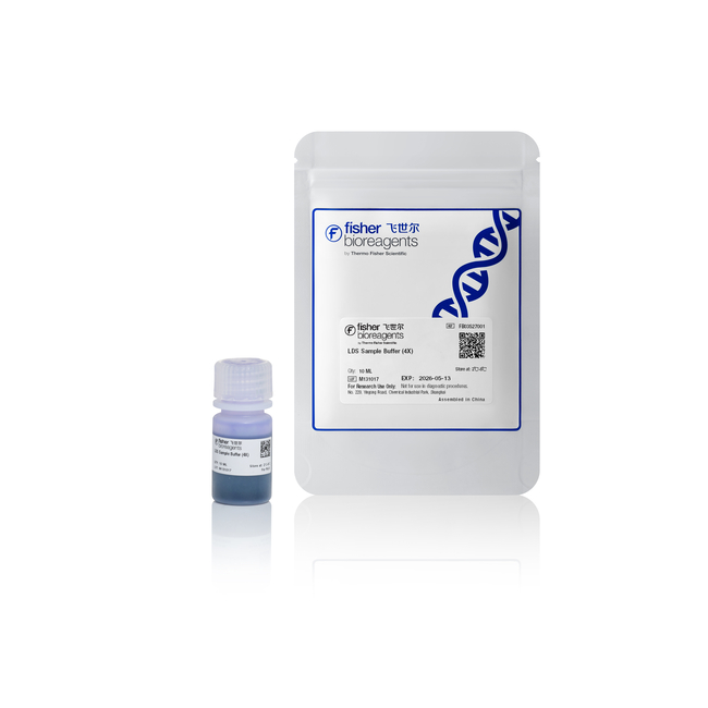 LDS 上样缓冲液 (4X) 适用于 Bis-Tris/Tris-乙酸凝胶的变性蛋白样品制备。含十二烷基硫酸锂(pH 8.4),可最大化还原剂活性;采用考马斯G250与酚红替代溴酚蓝作为示踪染料,其中考马斯G250更接近离子迁移前沿,可防止小肽丢失。